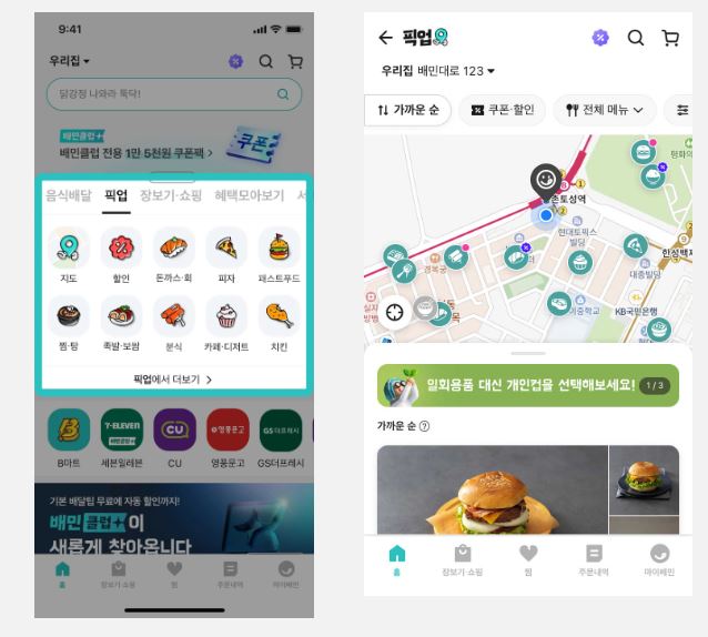 배민포장주문을 이용하는 가게는 배민앱 메인 홈 픽업 카테고리에서 가게를 확인할 수 있어요.